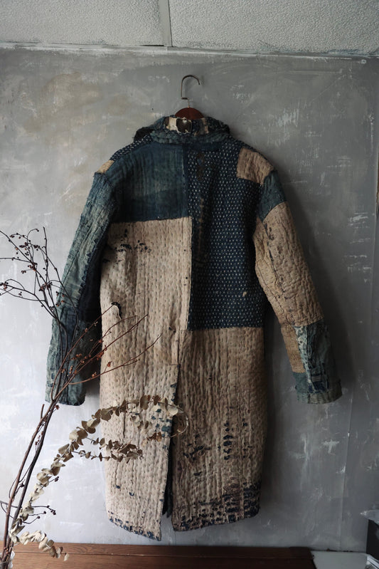 heavy washed zip up long denim kimono combined with Boro vintage japan fabric