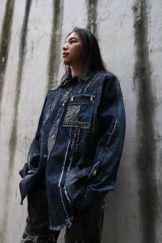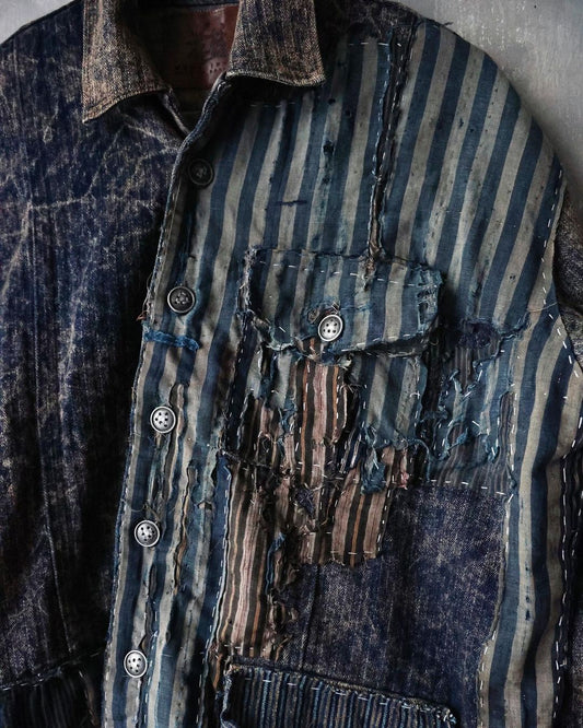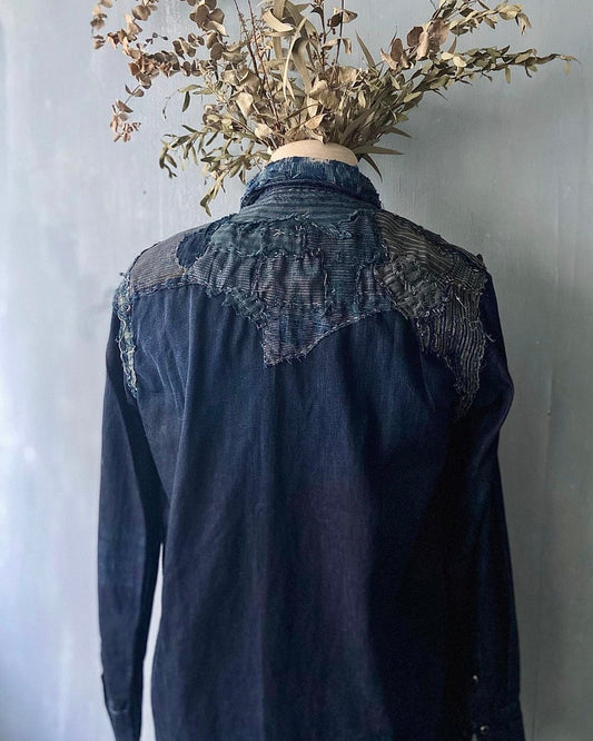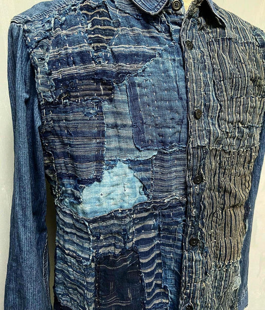 Washed denim shirt assembly with Boro vintage japan fabric
